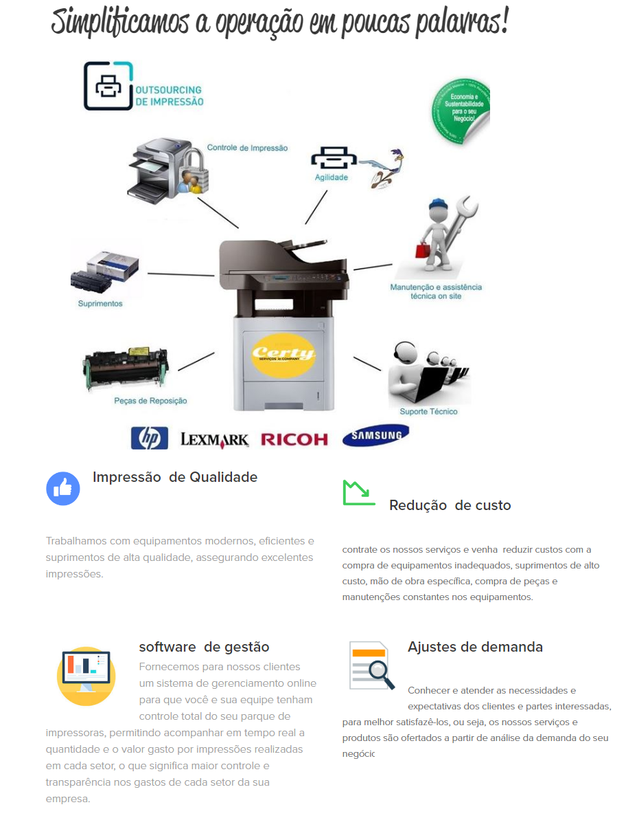 A certy foi criada para atender as necessidades das pessoas que buscam obter um serviço de qualidade e de confiança. Atualmente estamos atendendo: . Micro e pequenas empresas do comércio, serviço e indústrias. .Imobiliária, Escritórios de advogados, clínicas médicas,farmácia etc. . Profissionais liberais. . Pessoas físicas. Oferecemos aos nossos clientes qualidade, tecnologia e inovação em soluções de impressão e serviços. Com objetivo de proporcionar atendimento personalizado.
